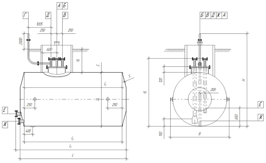 Обозначение Назначение Кол-во Проход условный, Ду, мм Давление условное, Ру, МПа Тип уплотнительной поверхности А Для наполнения 1 80 1,0 Гладкая Б Для раздачи 1 80 1,0 В Для зачистки 1 50 1,0 Г Для вентиляции 1 50 0,6 Д Люк замерный 1 50 1,0 Е Для входа теплоносителя 1 — — — Ж Для выхода теплоносителя 1 — — — -