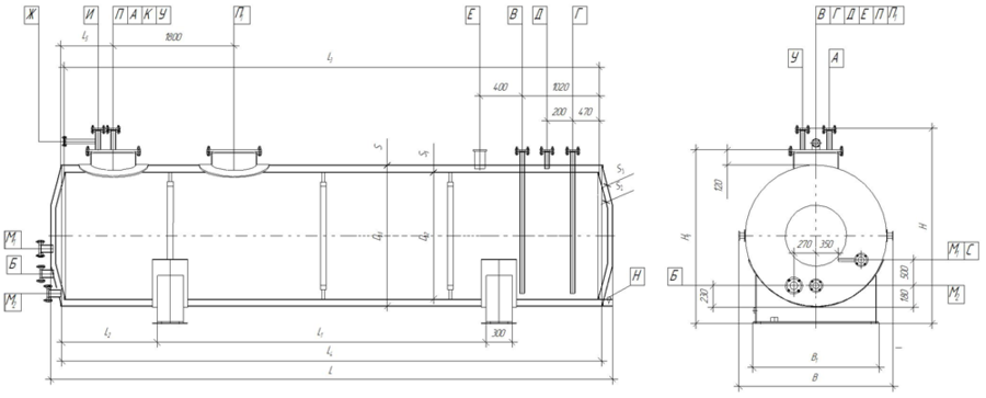 Обозначение Назначение Кол-во Проход условный, Ду, мм Давление условное, Ру, МПа Тип уплотнительной поверхности А Для наполнения 1 100 0,6 Шип-паз Б Для выдачи продукта 1 80 0,6 Шип-паз В Линия обесшламливания 1 40 1,0 Гладкая Г Для дренажа межстенного пространства 1 40 0,6 Гладкая Д Для наполнения азотом межстенного пространства 1 40 0,6 Гладкая Е Для выхода воздуха 1 G ? -B — Резьба Ж Для дыхательного клапана резервуара 1 50 0,6 Гладкая И Для замерного устройства 1 150 0,6 Гладкая К Для датчика сигнализации наполнения 1 120 0,6 Гладкая Л Для датчика системы блокировки от переполнения 1 120 0,6 Гладкая М1, М2 Для входа и выхода теплоносителя 2 40 1 Гладкая Н Для сигнализатора «Сигма-1» 1 25 0,6 Шип-паз П Люк для установки технологического оборудования 1 800 0,3 Гладкая П1 Люк смотровой 1 800 0,3 Гладкая Р Для термометра 1 М27х2-7Н — Резьба С Для термометра 1 M27х2-7Н — Резьба Т Для манометра 2 G 1/2 — Резьба У Механизм управления хлопушкой 1 — — Гладкая