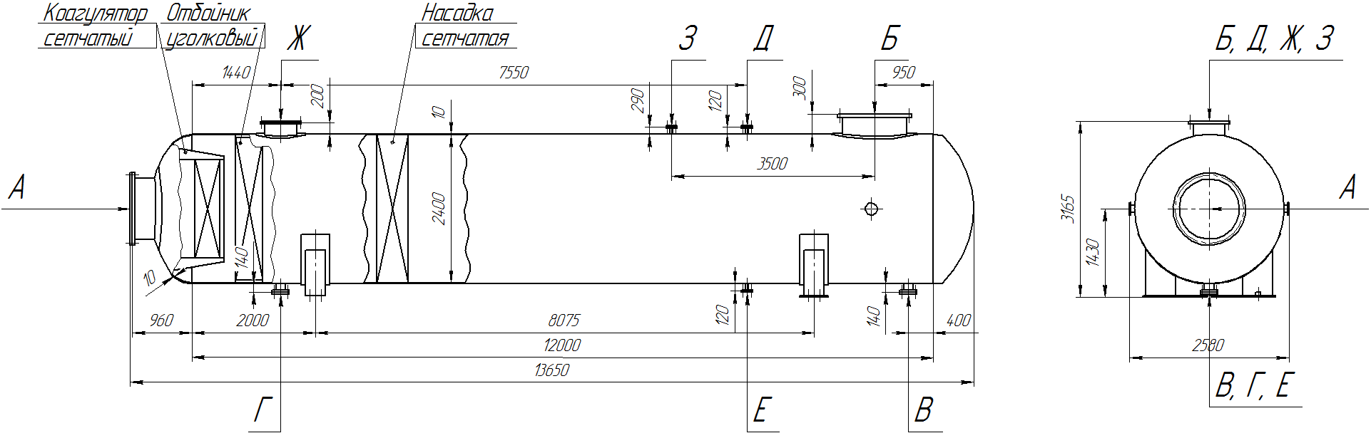 Обозначение Назначение Условное обозначение сепаратора 1000-1 1800-1 2400-1 3200-1 1000-2 1800-2 2400-2 3200-2 Кол. Проход условный Dy, мм Кол. Проход условный Dy, мм Кол. Проход условный Dy, мм Кол. Проход условный Dy, мм А вход газа 1 400 1 400 1 1000 1 1400 Б выход газа В выход жидкости 100 150 200 300 Г дренаж 150 100 150 Д для уравнительной линии 50 50 50 50 Е для проварки Ж люк-лаз 450 450 450 450