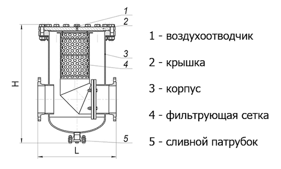 Корпус механизма выполняется в форме полого цилиндра, к нему приварено два отвода — для входа и выхода среды. Внутри расположен сетчатый фильтр, для доступа к которому предназначен лючок, и отстойник. Прибор для очистки приваривают к трубе или привинчивают с помощью фланцев.
